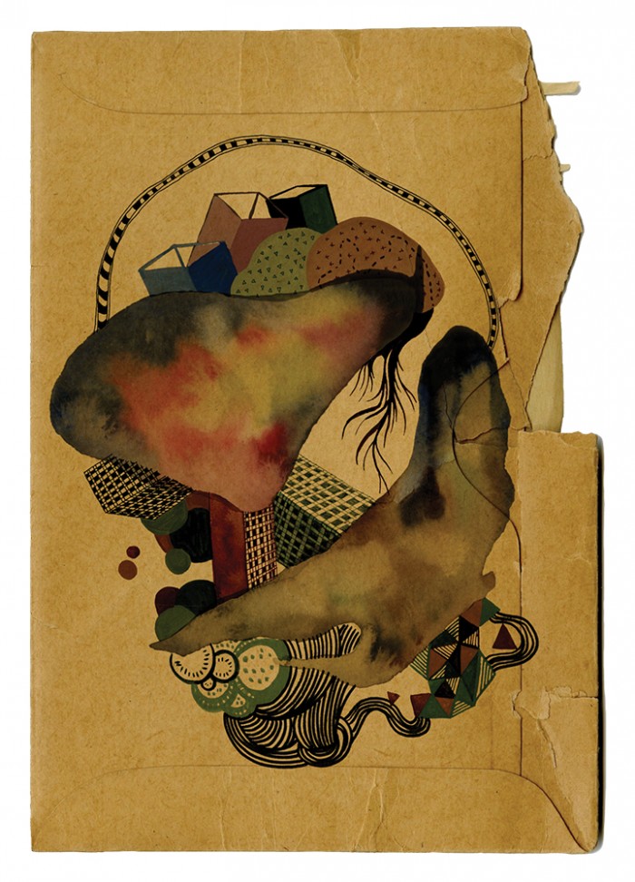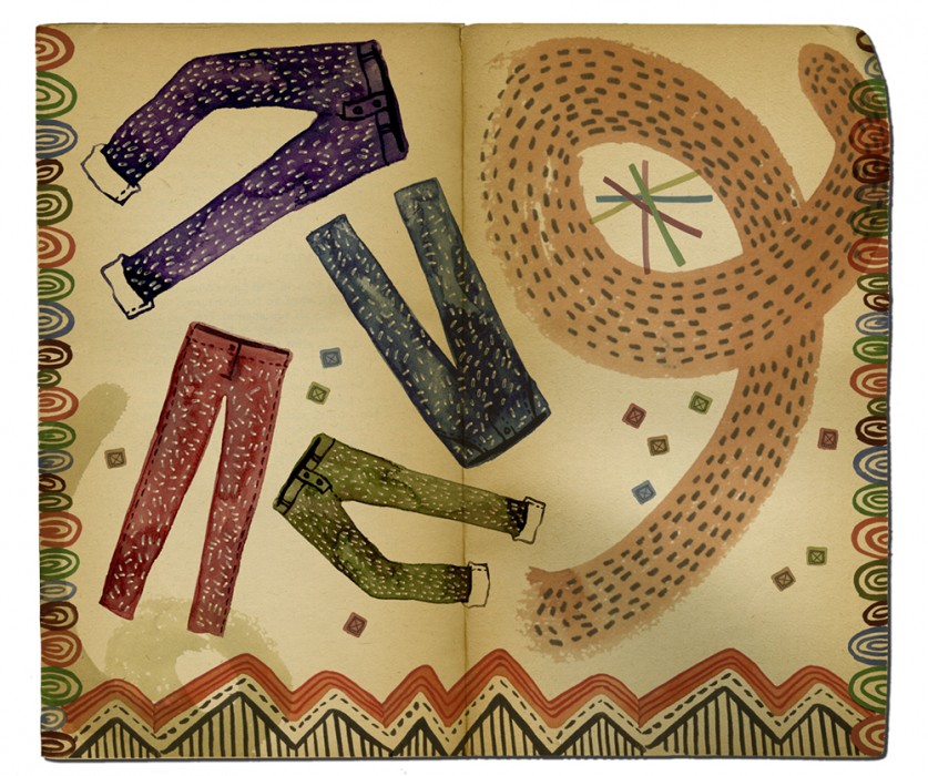 Each illustration describes obsession with smart phones, make-up, mustache, jeans, and patterns.