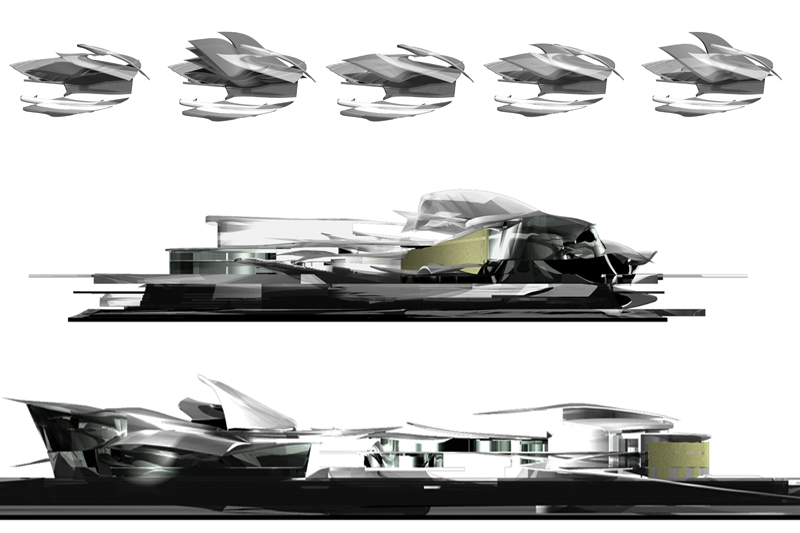 The architecture of the Performing Arts Centre is to be a regulator between different criteria, and the constant negotiations between the opposing factors creates energy through out the site and thus the architecture we created has incorporated this very important property. The movable roofs are also responsive devices reacting to social behavior, weather, occupancy and performances. The roofs enable interactions between performance and theatrics spaces, this allow huge flexibility on performance and the exploration of new ways of performing. The movable elements celebrate the idea of using the performing arts centre as the monument of uniting national and international cultures and representing the energetic people of the cities.